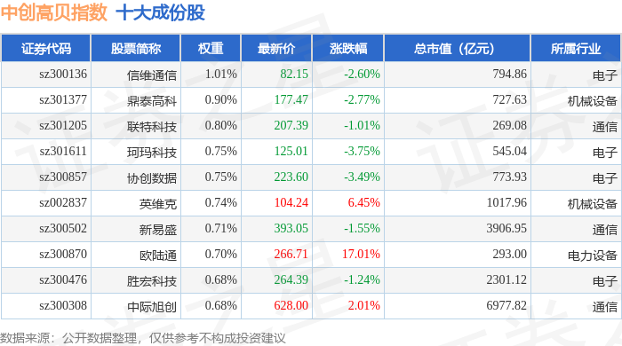 证券之星消息,1月28日,中创高贝(399666)指数报收于2335.78点,跌0.64%,成交4622.18亿元,换手率5.81%。当日该指数成份股中,上涨的有58家,欧陆通以17.01%的涨幅领涨,下跌的有141家,沃尔核材以10.01%的跌幅领跌。