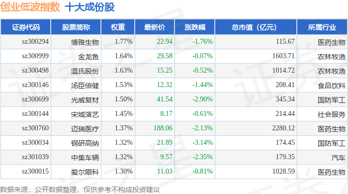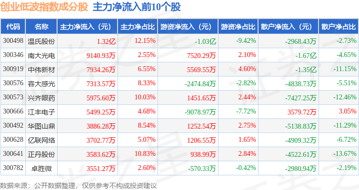 资金流向方面,创业低波(399692)指数成份股当日主力资金净流出合计37.24亿元,游资资金净流入合计9.72亿元,散户资金净流入合计27.53亿元。成份股资金流向详情见下表: