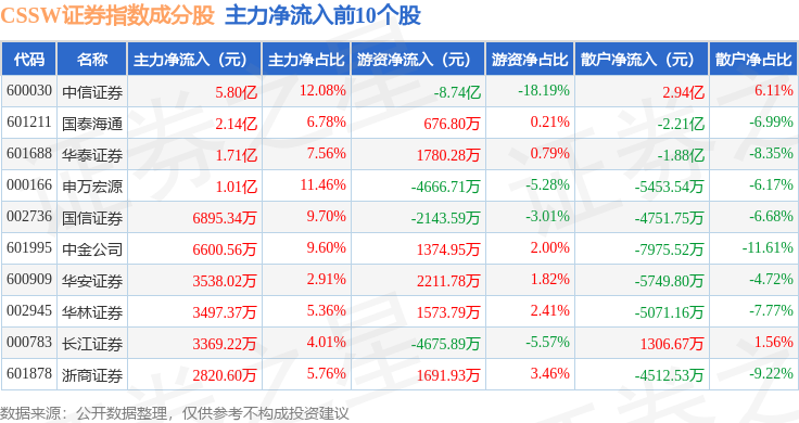 资金流向方面,CSSW证券(399707)指数成份股当日主力资金净流出合计5522.2万元,游资资金净流出合计5536.28万元,散户资金净流入合计1.11亿元。成份股资金流向详情见下表: