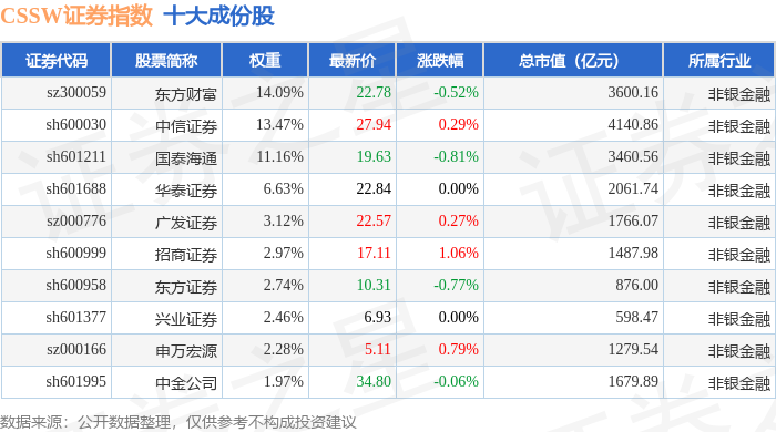 CSSW证券(399707)指数十大成份股详情如下: