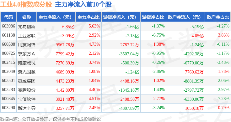 资金流向方面,工业4.0(399803)指数成份股当日主力资金净流出合计41.52亿元,游资资金净流入合计11.0亿元,散户资金净流入合计30.5亿元。成份股资金流向详情见下表: