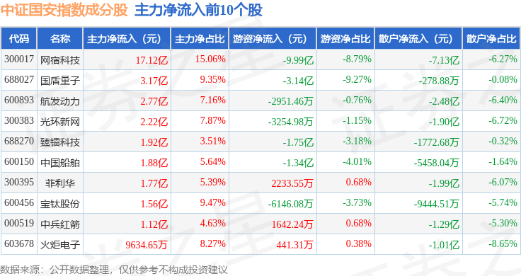 资金流向方面,中证国安(399813)指数成份股当日主力资金净流出合计57.77亿元,游资资金净流入合计7.94亿元,散户资金净流入合计49.83亿元。成份股资金流向详情见下表: