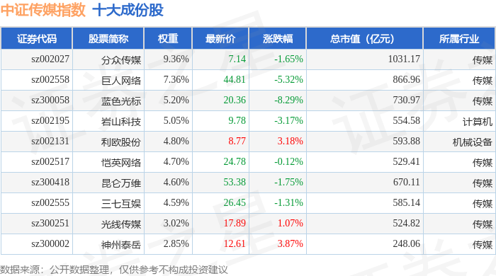中证传媒(399971)指数十大成份股详情如下: