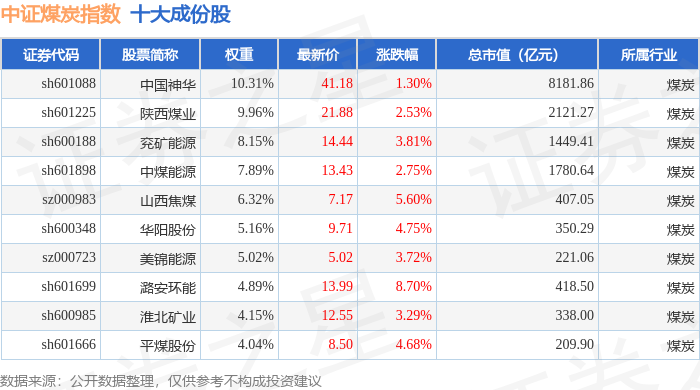 资金流向方面,中证煤炭(399998)指数成份股当日主力资金净流入合计10.83亿元,游资资金净流出合计7523.27万元,散户资金净流出合计10.08亿元。成份股资金流向详情见下表: