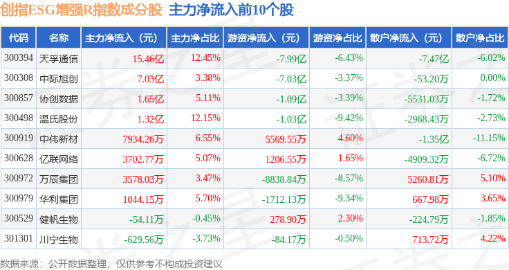 资金流向方面,创指ESG增强R(470034)指数成份股当日主力资金净流出合计54.52亿元,游资资金净流出合计4.66亿元,散户资金净流入合计59.18亿元。成份股资金流向详情见下表: