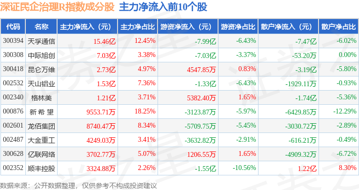 资金流向方面,深证民企治理R(470058)指数成份股当日主力资金净流出合计34.05亿元,游资资金净流出合计10.66亿元,散户资金净流入合计44.72亿元。成份股资金流向详情见下表: