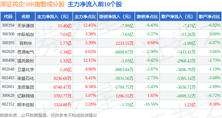 资金流向方面,深证民企50R(470057)指数成份股当日主力资金净流出合计83.22亿元,游资资金净流出合计12.22亿元,散户资金净流入合计95.44亿元。成份股资金流向详情见下表: