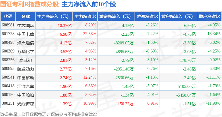 资金流向方面,国证专利R(480070)指数成份股当日主力资金净流出合计89.37亿元,游资资金净流入合计12.58亿元,散户资金净流入合计76.79亿元。成份股资金流向详情见下表: