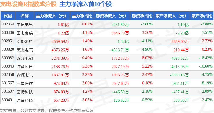 资金流向方面,充电设施R(480077)指数成份股当日主力资金净流出合计32.16亿元,游资资金净流入合计3.52亿元,散户资金净流入合计28.5亿元。成份股资金流向详情见下表: