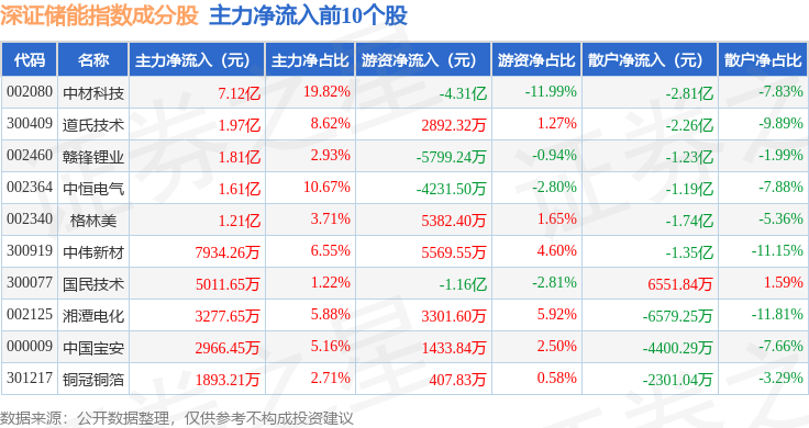 资金流向方面,深证储能(970036)指数成份股当日主力资金净流出合计69.38亿元,游资资金净流入合计5.41亿元,散户资金净流入合计63.97亿元。成份股资金流向详情见下表: