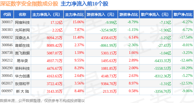 资金流向方面,深证数字安全(970052)指数成份股当日主力资金净流入合计10.27亿元,游资资金净流出合计6.62亿元,散户资金净流出合计3.65亿元。成份股资金流向详情见下表: