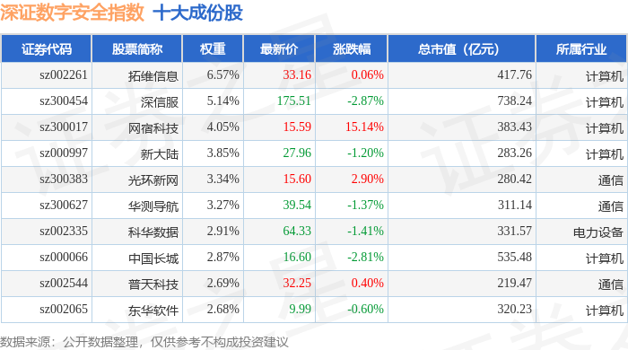 证券之星消息,1月28日,深证数字安全(970052)指数报收于3748.62点,涨0.21%,成交525.53亿元,换手率6.19%。当日该指数成份股中,上涨的有16家,网宿科技以15.14%的涨幅领涨,下跌的有33家,拓尔思以4.12%的跌幅领跌。