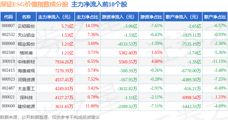 资金流向方面,深证ESG价值(970061)指数成份股当日主力资金净流出合计22.21亿元,游资资金净流出合计3.6亿元,散户资金净流入合计25.81亿元。成份股资金流向详情见下表: