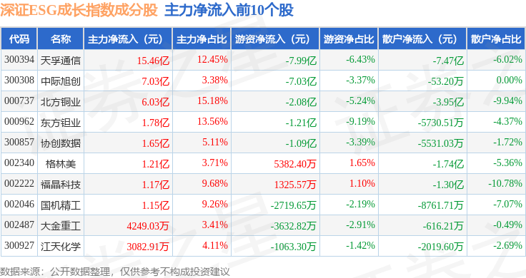 资金流向方面,深证ESG成长(970060)指数成份股当日主力资金净流出合计15.5亿元,游资资金净流出合计13.61亿元,散户资金净流入合计29.11亿元。成份股资金流向详情见下表: