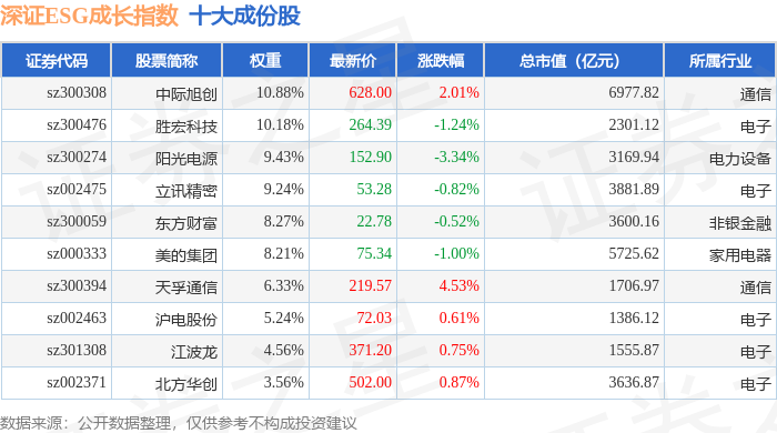 深证ESG成长(970060)指数十大成份股详情如下: