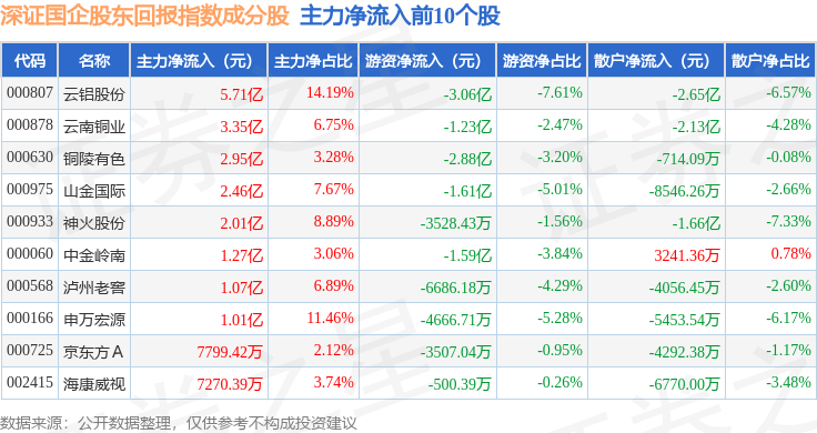 资金流向方面,深证国企股东回报(970064)指数成份股当日主力资金净流入合计14.13亿元,游资资金净流出合计15.5亿元,散户资金净流入合计1.37亿元。成份股资金流向详情见下表: