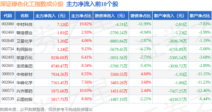 资金流向方面,深证绿色化工(970076)指数成份股当日主力资金净流出合计19.66亿元,游资资金净流入合计2.82亿元,散户资金净流入合计16.85亿元。成份股资金流向详情见下表: