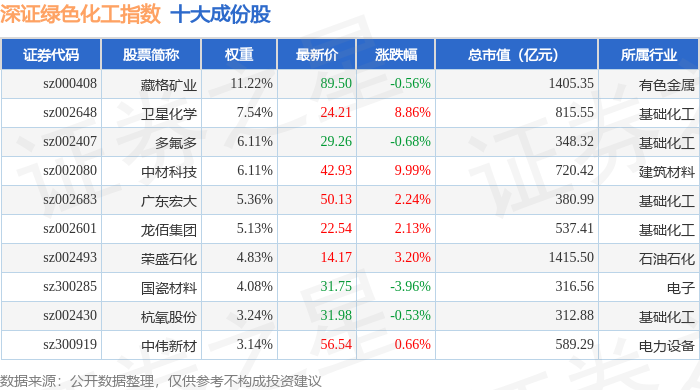 证券之星消息,1月28日,深证绿色化工(970076)指数报收于1979.19点,涨1.77%,成交620.87亿元,换手率2.87%。当日该指数成份股中,上涨的有29家,中材科技以9.99%的涨幅领涨,下跌的有21家,沃尔核材以10.01%的跌幅领跌。
