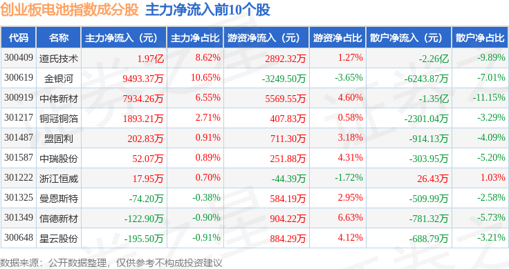 资金流向方面,创业板电池(970081)指数成份股当日主力资金净流出合计51.76亿元,游资资金净流入合计10.61亿元,散户资金净流入合计41.15亿元。成份股资金流向详情见下表: