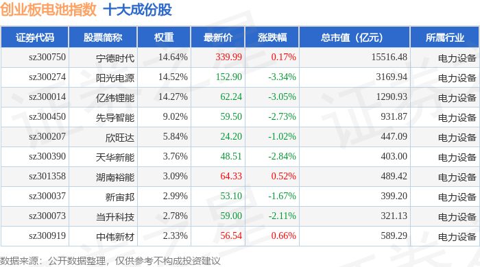 创业板电池(970081)指数十大成份股详情如下: