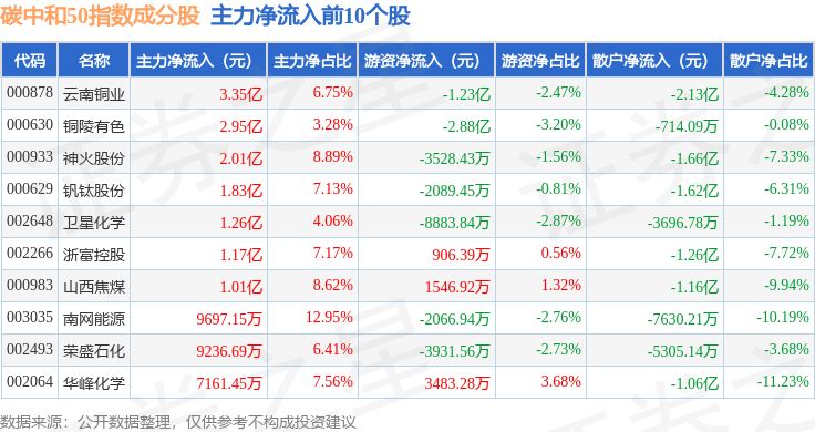 资金流向方面,碳中和50(980021)指数成份股当日主力资金净流出合计15.3亿元,游资资金净流出合计8780.34万元,散户资金净流入合计16.17亿元。成份股资金流向详情见下表: