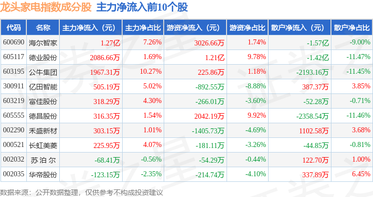 资金流向方面,龙头家电(980028)指数成份股当日主力资金净流出合计13.86亿元,游资资金净流出合计1.56亿元,散户资金净流入合计15.43亿元。成份股资金流向详情见下表: