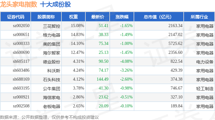 龙头家电(980028)指数十大成份股详情如下: