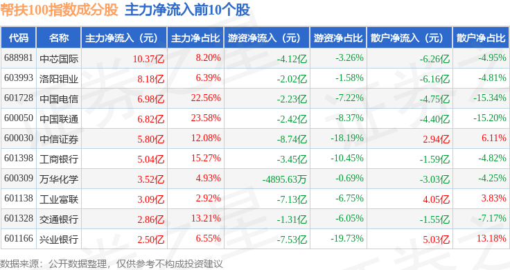 资金流向方面,帮扶100(980065)指数成份股当日主力资金净流出合计67.41亿元,游资资金净流出合计11.85亿元,散户资金净流入合计79.26亿元。成份股资金流向详情见下表: