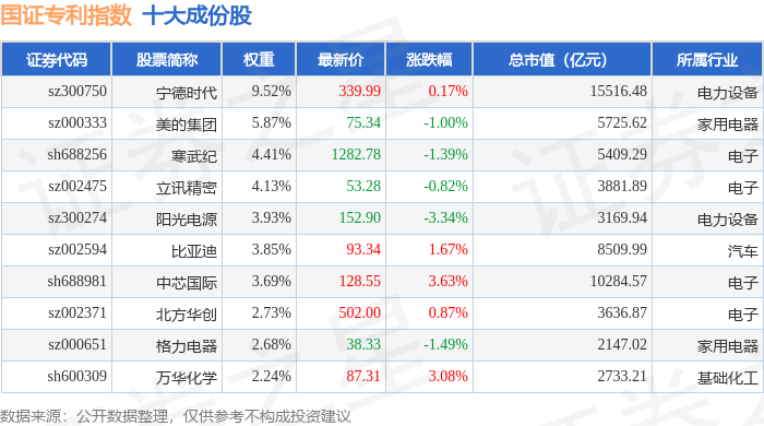 国证专利(980070)指数十大成份股详情如下: