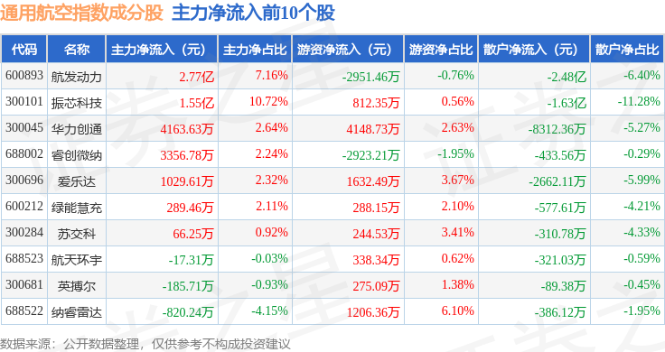 资金流向方面,通用航空(980076)指数成份股当日主力资金净流出合计46.71亿元,游资资金净流入合计8.02亿元,散户资金净流入合计38.7亿元。成份股资金流向详情见下表:
