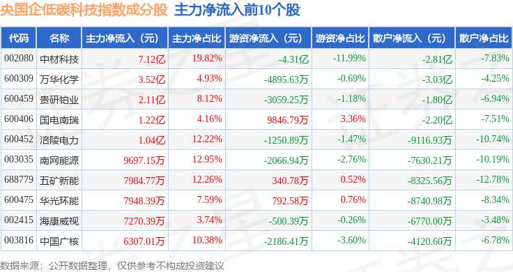 资金流向方面,央国企低碳科技(980082)指数成份股当日主力资金净流出合计11.97亿元,游资资金净流入合计3.1亿元,散户资金净流入合计8.87亿元。成份股资金流向详情见下表: