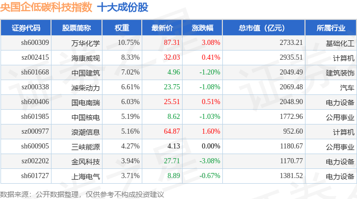 央国企低碳科技(980082)指数十大成份股详情如下: