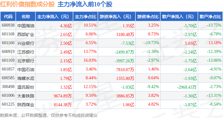 资金流向方面,红利价值(980103)指数成份股当日主力资金净流入合计1.73亿元,游资资金净流出合计9.48亿元,散户资金净流入合计7.75亿元。成份股资金流向详情见下表: