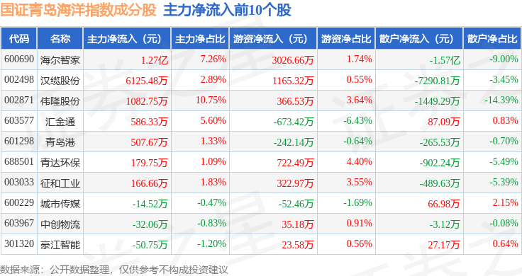 资金流向方面,国证青岛海洋(980532)指数成份股当日主力资金净流出合计7727.4万元,游资资金净流入合计1.54亿元,散户资金净流出合计9526.36万元。成份股资金流向详情见下表: