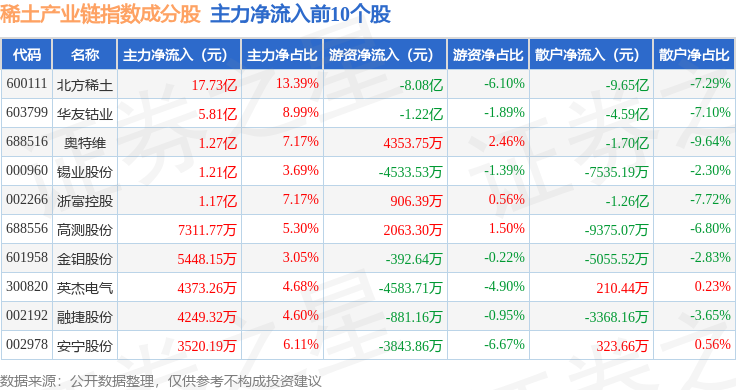 资金流向方面,稀土产业链(989013)指数成份股当日主力资金净流出合计33.7亿元,游资资金净流出合计1.4亿元,散户资金净流入合计35.1亿元。成份股资金流向详情见下表: