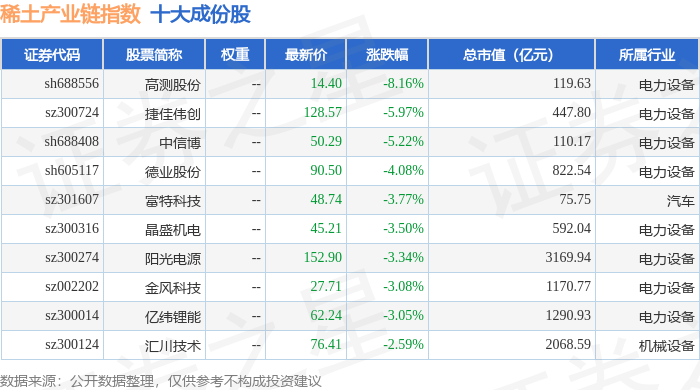 证券之星消息,1月28日,稀土产业链(989013)指数报收于3976.84点,跌0.19%,成交1259.68亿元,换手率3.6%。当日该指数成份股中,上涨的有25家,英杰电气以9.42%的涨幅领涨,下跌的有25家,高测股份以8.16%的跌幅领跌。