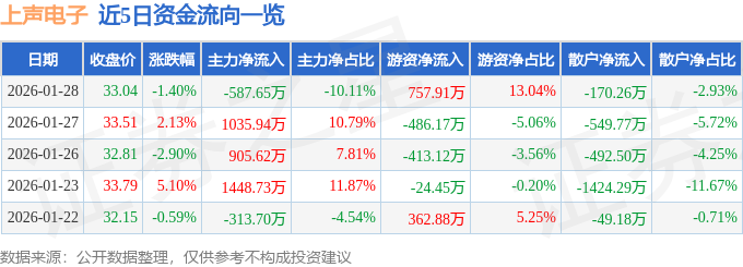 证券之星消息,截至2026年1月28日收盘,上声电子(688533)报收于33.04元,下跌1.4%,换手率1.08%,成交量1.76万手,成交额5811.9万元。