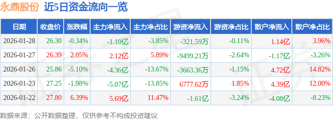 证券之星消息,截至2026年1月28日收盘,永鼎股份(600105)报收于26.3元,下跌0.34%,换手率7.41%,成交量108.34万手,成交额28.69亿元。