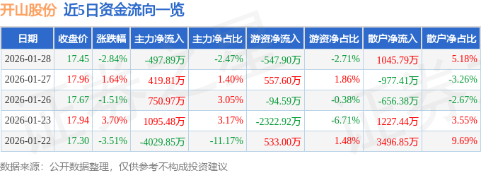 证券之星消息,截至2026年1月28日收盘,开山股份(300257)报收于17.45元,下跌2.84%,换手率1.21%,成交量11.53万手,成交额2.02亿元。