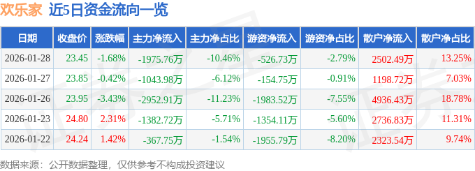 证券之星消息,截至2026年1月28日收盘,欢乐家(300997)报收于23.45元,下跌1.68%,换手率2.07%,成交量8.0万手,成交额1.89亿元。