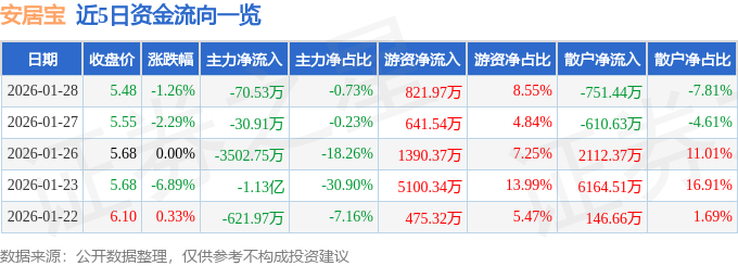 证券之星消息,截至2026年1月28日收盘,安居宝(300155)报收于5.48元,下跌1.26%,换手率5.28%,成交量17.48万手,成交额9619.26万元。