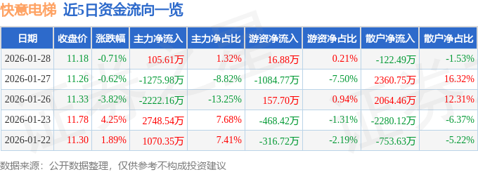 证券之星消息,截至2026年1月28日收盘,快意电梯(002774)报收于11.18元,下跌0.71%,换手率2.54%,成交量7.15万手,成交额7992.98万元。
