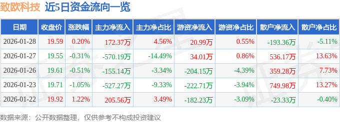 证券之星消息,截至2026年1月28日收盘,致欧科技(301376)报收于19.59元,上涨0.2%,换手率1.0%,成交量1.93万手,成交额3782.48万元。