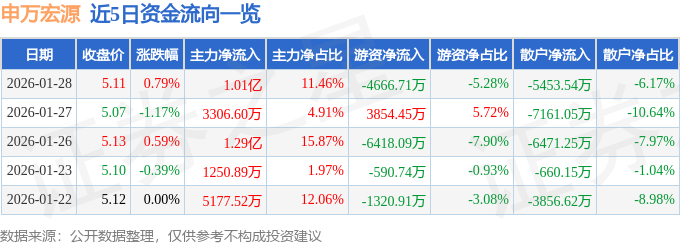 证券之星消息,截至2026年1月28日收盘,申万宏源(000166)报收于5.11元,上涨0.79%,换手率0.77%,成交量172.69万手,成交额8.83亿元。