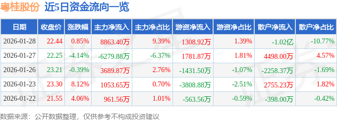 证券之星消息,截至2026年1月28日收盘,粤桂股份(000833)报收于22.44元,上涨0.85%,换手率9.3%,成交量42.2万手,成交额9.44亿元。