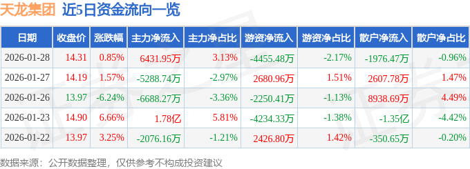 证券之星消息,截至2026年1月28日收盘,天龙集团(300063)报收于14.31元,上涨0.85%,换手率22.73%,成交量142.42万手,成交额20.56亿元。