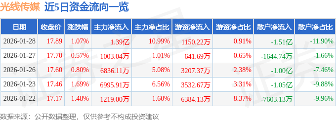证券之星消息,截至2026年1月28日收盘,光线传媒(300251)报收于17.89元,上涨1.07%,换手率2.56%,成交量70.93万手,成交额12.67亿元。