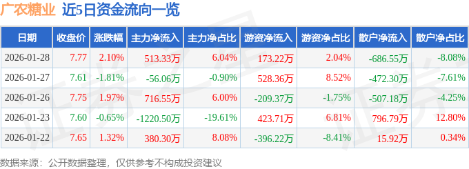 证券之星消息,截至2026年1月28日收盘,广农糖业(000911)报收于7.77元,上涨2.1%,换手率2.76%,成交量11.04万手,成交额8492.44万元。