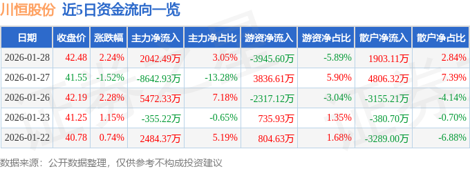 证券之星消息,截至2026年1月28日收盘,川恒股份(002895)报收于42.48元,上涨2.24%,换手率2.68%,成交量16.0万手,成交额6.7亿元。