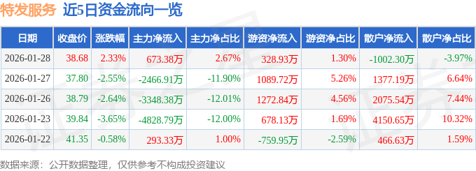 证券之星消息,截至2026年1月28日收盘,特发服务(300917)报收于38.68元,上涨2.33%,换手率3.9%,成交量6.59万手,成交额2.53亿元。